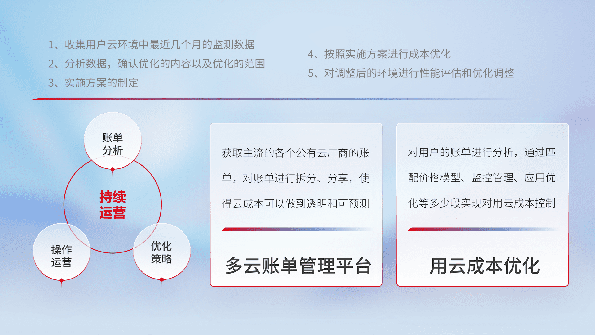 通过多云纳管,,,,以统一的资源数据模型把客户的云资源进行抽象和封装,,,,进而实现对多云资源的统一操作,,,保障云资源管理的可靠性、、稳定性与可用性。。。量身定制化运维内容,,,,配置、、、开发运维、、补丁管理、、、备份、、、、监控、、、、认证和访问管理、、、、审计和日常巡检等,,,保障在用云过程中的可靠度,,稳定度以及高可用率。。